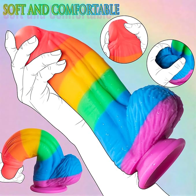 Compatible with strap on harnesses, this rainbow dildo is perfect for targeting the G-spot or the P-spot with ease, making it a versatile toy for solo or partnered play.