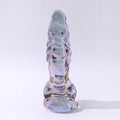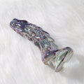 The Dragon Glass Dildo is 6 inches long, 2.63 inches wide at the base, and weighs 416 grams. It features a fantasy texture that simulates a dragon's head and scales, with an iridescent sheen that changes color under different lighting conditions. The irregular surface and satisfying weight create unique pressure and stimulation, ensuring deep, internal pleasure whether inserted vaginally or anally. The dragon dildo's curved shape allows for precise stimulation of the G-spot or P-spot, making it a perfect collector's choice for unique design and craftsmanship.