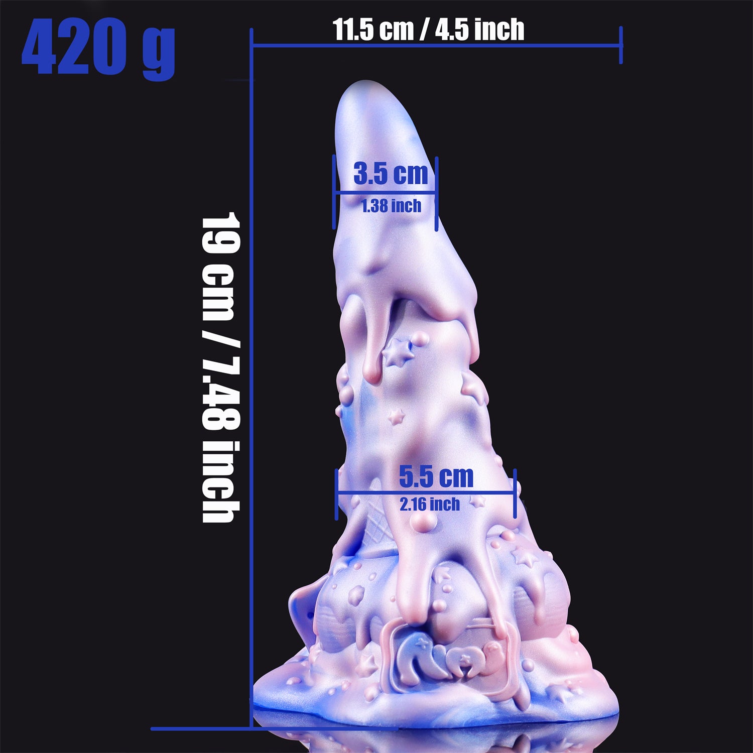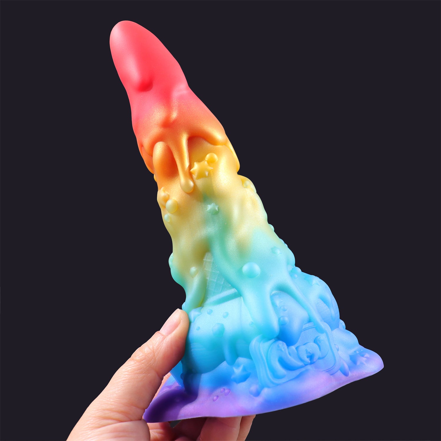 The tapered tip offers gentle, easy insertion, while the gradually widening body is sculpted with soft textures, stars, and drippy details that provide intense stimulation. With a total length of 7.48 inches and an insertable length of 4.5 inches, it’s ideal for users looking for medium-sized girth with maximum artistic flair. The widest point measures 2.16 inches, delivering a satisfying stretch for those ready for the next level.