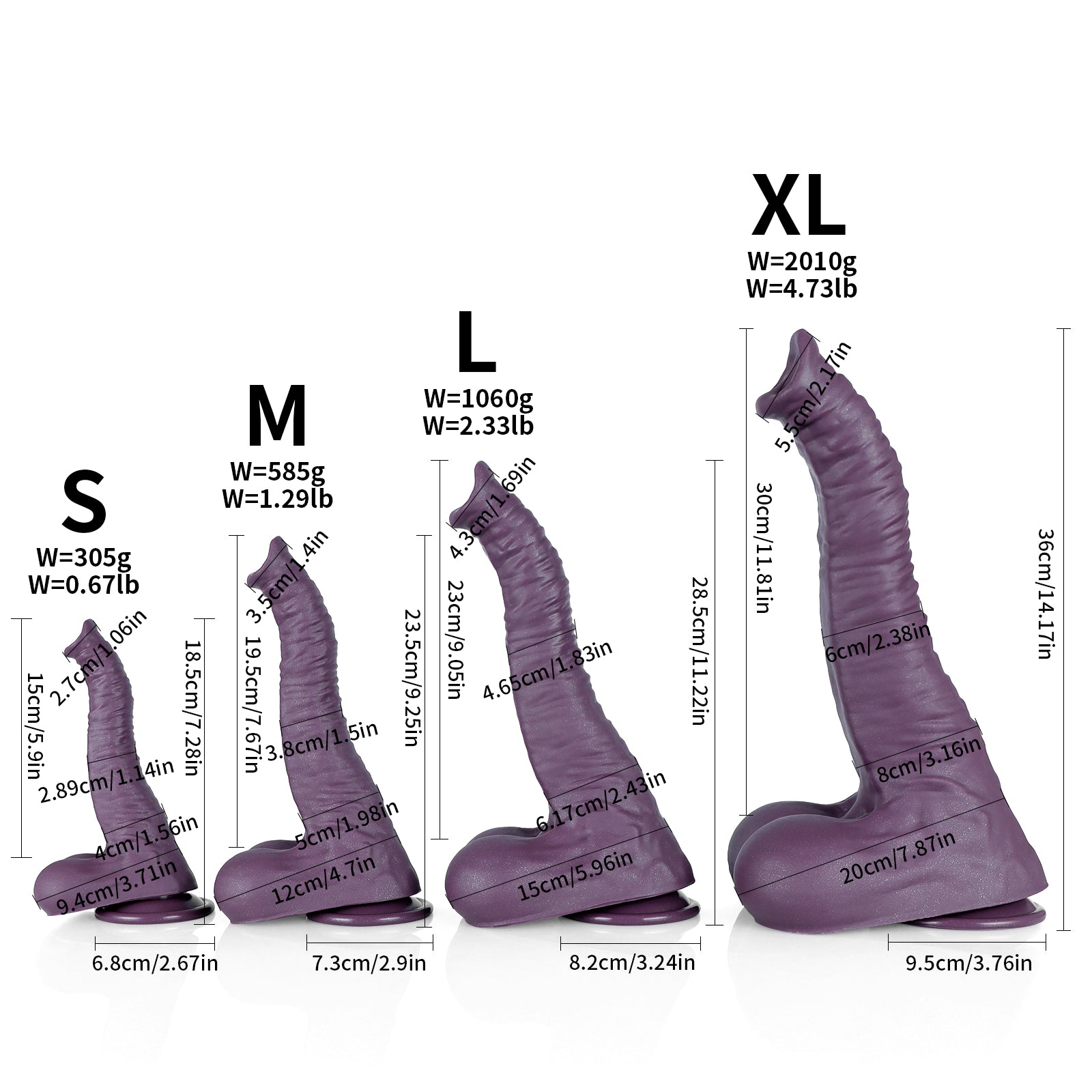 - Multiple Size Options: This purple elephant trunk dildo is available in 5 different sizes. The smallest measures 6 inches long and 1 inch thick, making it perfect for beginners, while the largest measures 12 inches long and 2 inches thick, ideal for advanced users seeking deeper penetration. No matter what kind of stimulation you're after, you’ll find the perfect size for your needs.